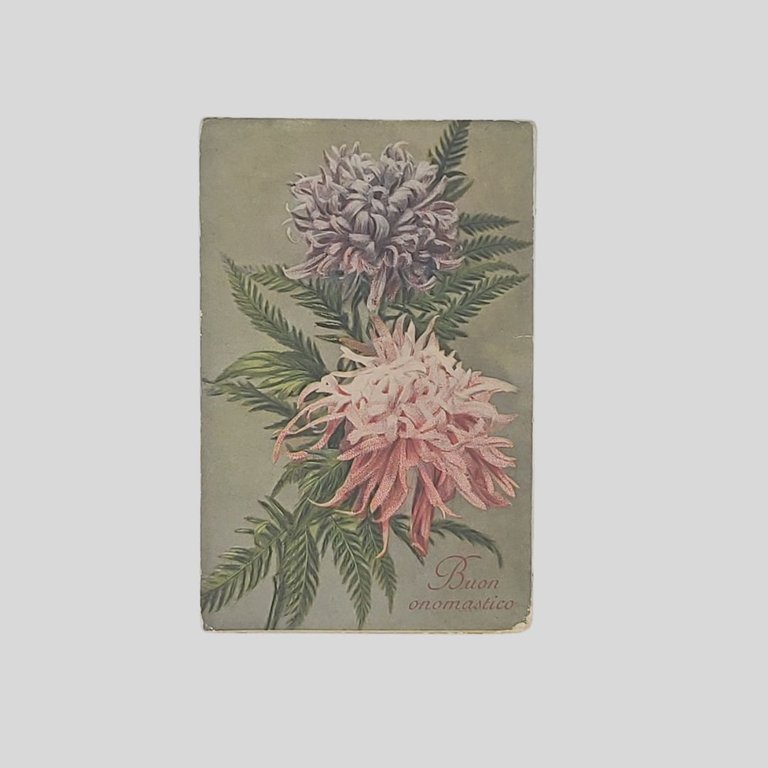 Cartolina augurale d’epoca. Viaggiata, cm 9×13,8. Francobollo, timbro. Tracce d’uso ai margini. Serie 3048-16