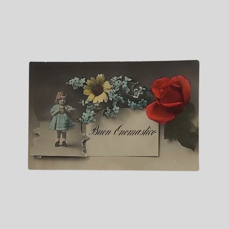 Cartolina augurale fotografica d’epoca. Non viaggiata, invio di mano sincrona, cm 13,7×8,7. Lievemente ondulata. Serie 1117. In buone conizioni.