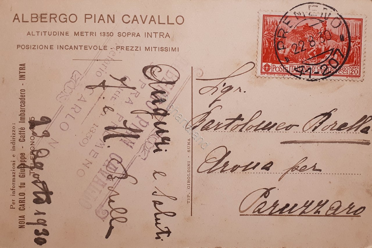 Cartolina - Albergo Piancavallo sopra Intra - Altitudine - 1930