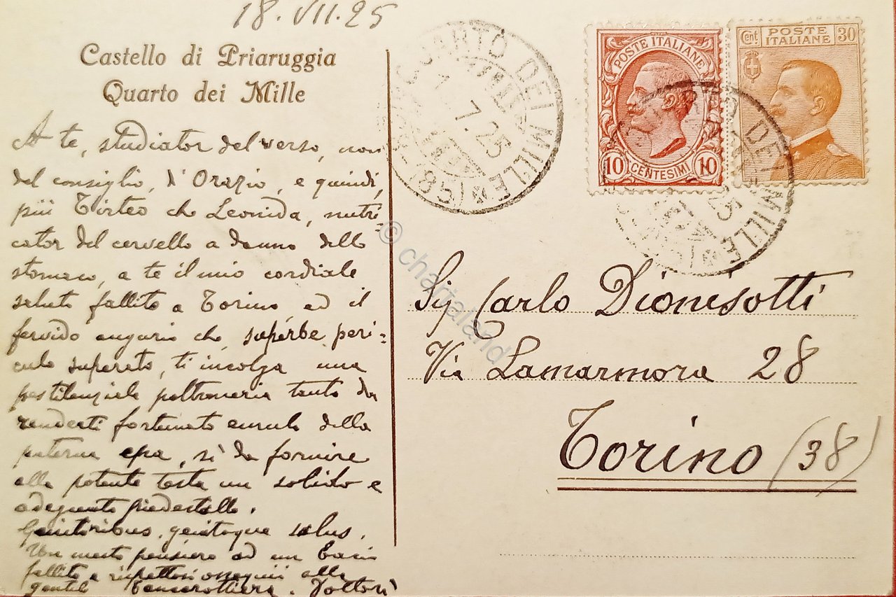 Cartolina - Castello di Priaruggia ( Genova ) - Quarto dei Mille - 1925