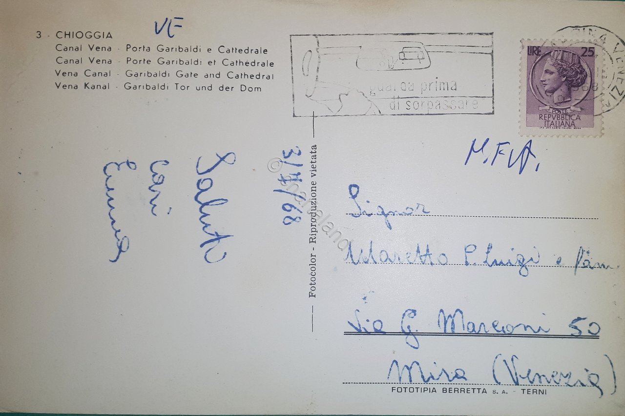 Cartolina - Chioggia - Canal Vena - Porta Garibaldi e Cattedrale - 1968