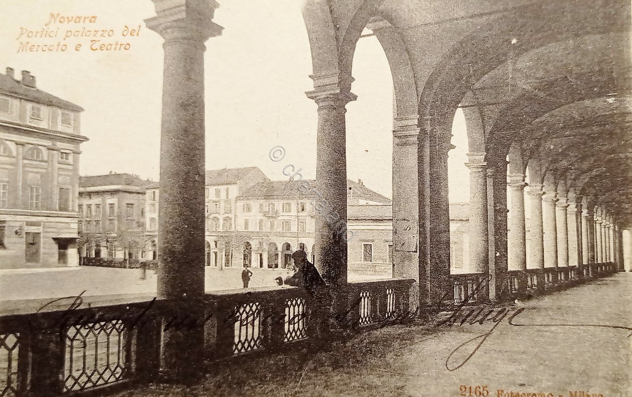 Cartolina - Novara - Portici Palazzo del Mercato e Teatro - 1909