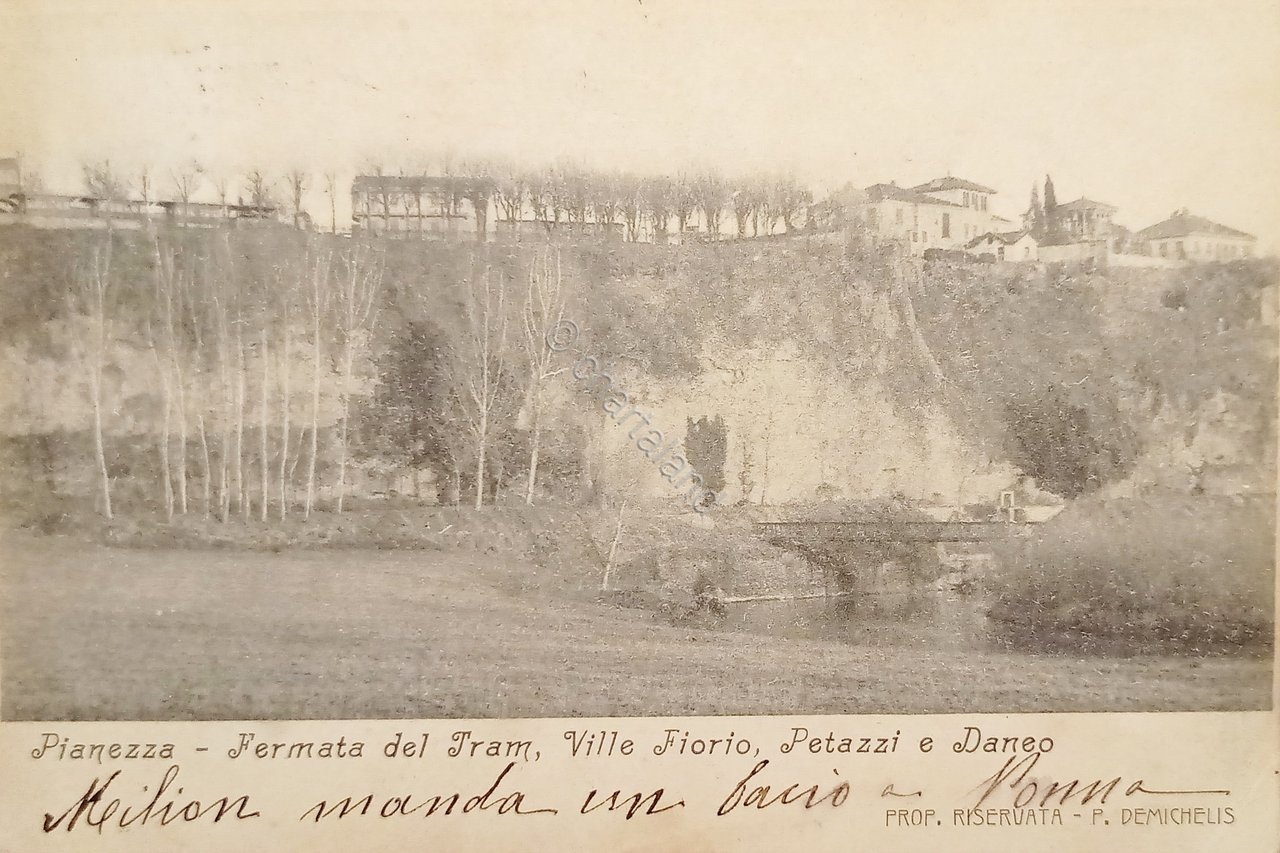 Cartolina - Pianezza - Fermata del Tram - Ville Fiorio, Petazzi e Daneo - 1905