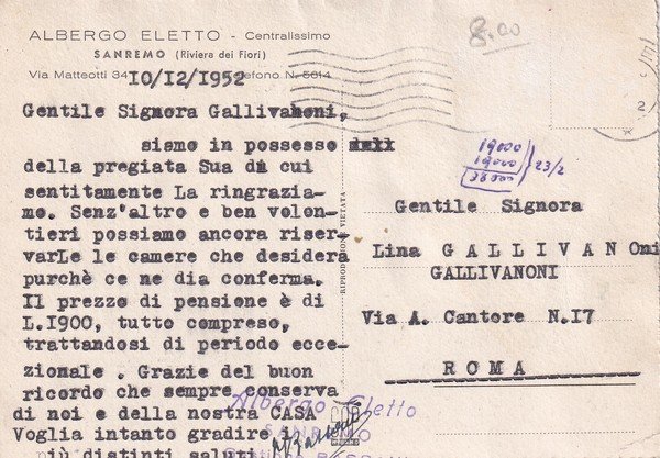 Cartolina ALBERGO ELETTO - Centralissimo. SANREMO (Riviera dei Fiori) 1952