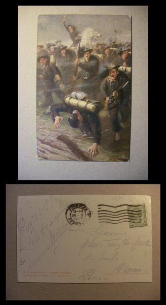 Cartolina "Avanti Savoia!" Bersaglieri - Campestrini. La conquista del Monte Nero 1915. Spedita 1917