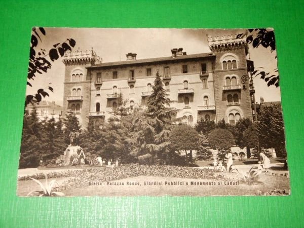 Cartolina Biella - Palazzo Ronco, Giardini Pubblici e Monumento ai Caduti 1931