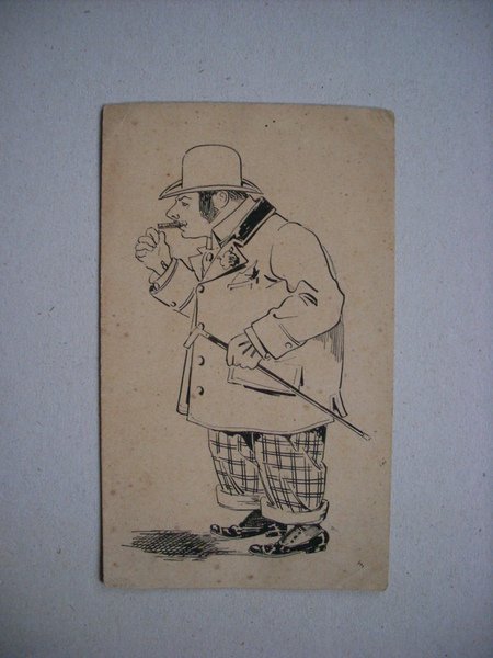 Cartolina / Cartoncino litografia e china a mano (uomo con bombetta,sigaro,bastone)