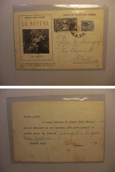 Cartolina Cedola di commissione Libraria. Angelo Della Massa "La Bufera" 1953
