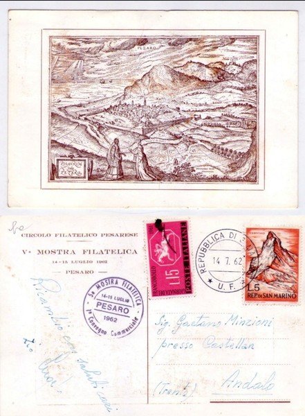 Cartolina Circolo filatelico pesarese. V° Mostra Filatelica 14-15 luglio 1962 Pesaro.