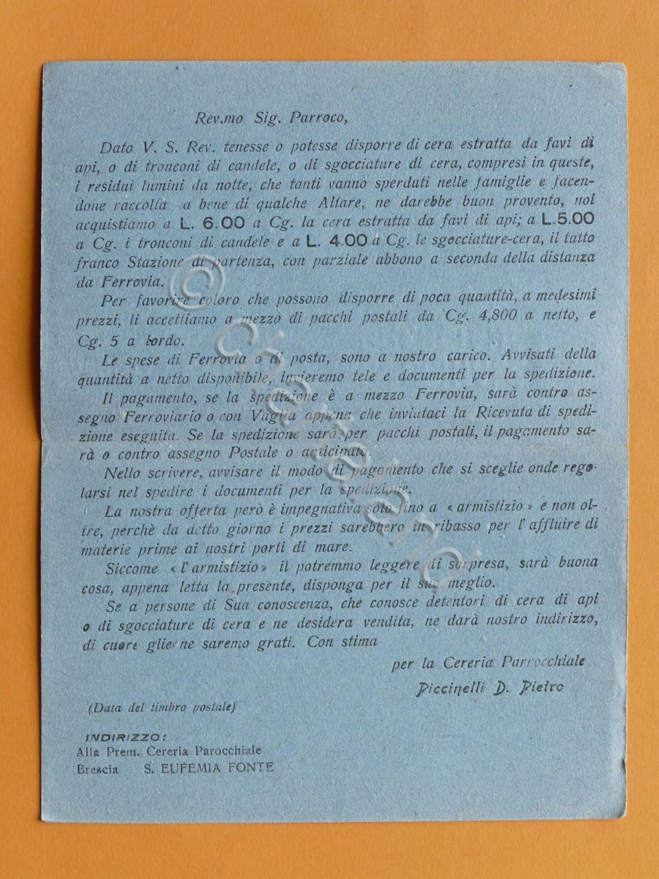 Cartolina doppia Pubblicitaria - Premiata Cereria Parrocchiale Bresciana - 1918