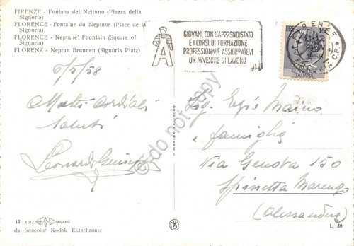 Cartolina Firenze Fontana di Nettuno Timbro a targhetta apprendistato 1958 | Cartoline |