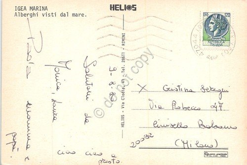 Cartolina Igea Marina panorama dal mare pedalò spiaggia alberghi case 1980