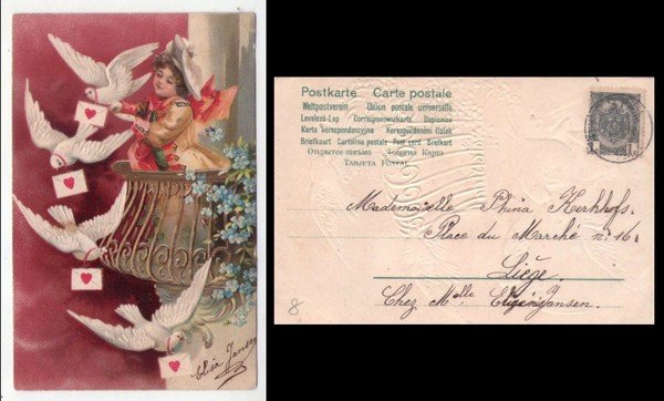 Cartolina illustrata SAN VALENTINO (colombe consegnano lettere d'amore). Primi'900