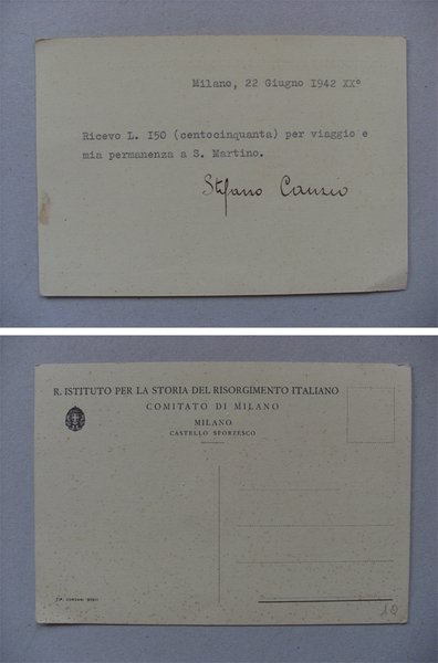 Cartolina invio "R. Istituto per la storia del Risorgimento Italiano - Comitato Milano Castello Sforzesco" Stefano Canzio