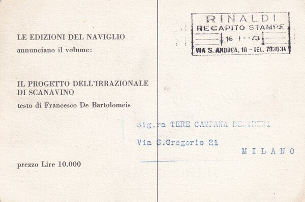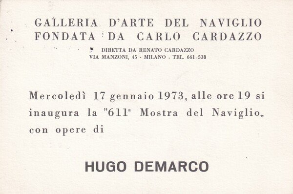 Cartolina/invito Mostra HUGO DEMARCO. Galleria d'Arte del Naviglio di Carlo Cardazzo - Milano 1973