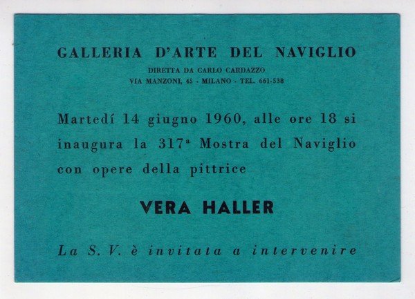 Cartolina/invito Mostra VERA HALLER. Galleria d´Arte del Naviglio di Carlo Cardazzo - Milano 1960