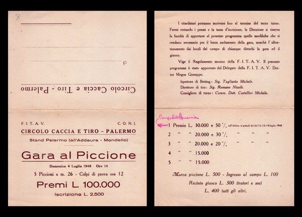 Cartolina iscrizione Circolo caccia e tiro - Palermo GARA AL PICCIONE 4 luglio 1948