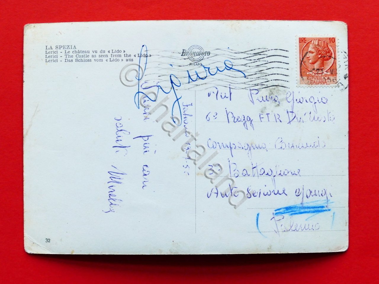 Cartolina La Spezia - Lerici - Il Castello visto dal Lido - 1956 1956 Cartolina formato grande - viaggiata Condizioni discrete, come da foto. Piccola piega all'angolo inferiore destro. Per appassionati, studiosi e collezionisti