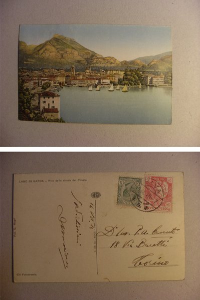 Cartolina "Lago di Garda - Riva dalla strada del Ponale" Copia di Valori Gemelli 5 centesimi. 1919