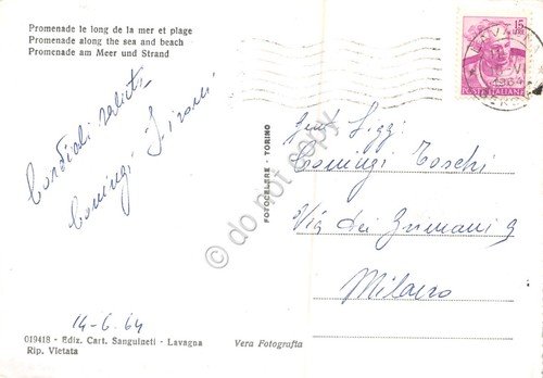 Cartolina Lavagna Lungomare e spiaggia ombrelloni animata 1964 | Cartoline |