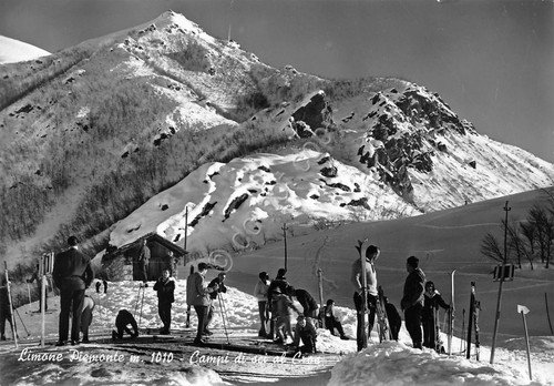 Cartolina Limone Piemonte Campo di sci al Cros animata sci sciatori