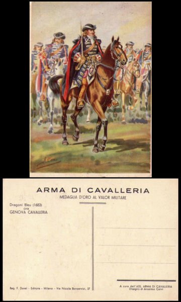 Cartolina Militare Arma di Cavalleria - Medaglia d'Oro al Valor militare "Dragoni Bleu 1683" Genova Cavalleria ill.Cervi