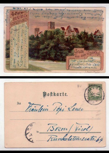Cartolina/postcard Burg. Grienwald - Gruss aus dem Isarthal. Primi'900