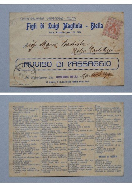 Cartolina / postcard Chincaglierie - Mercerie - Filati Figli di Luigi Magliola BIELLA. Avviso di passaggio.
