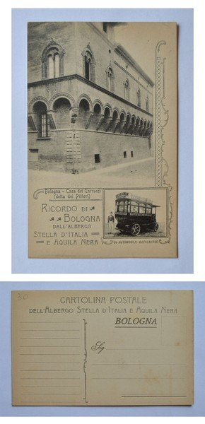 Cartolina / postcard Ricordo di Bologna dall'Albergo Stella D'Italia e Aquila Nera (Un automobile dell'Albergo)