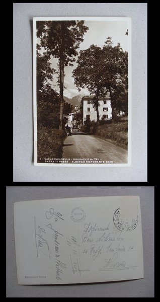 Cartolina / postcard Valle Chiusella - Drusacco (Torino) Entrata paese - Albergo Ristorante Eden. 1936