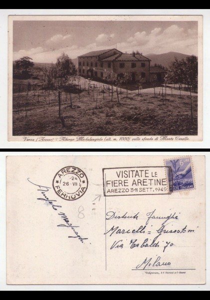 Cartolina/postcard VERNA (Arezzo) Albergo Michelangiolo collo sfondo di Monte Casella. 1949