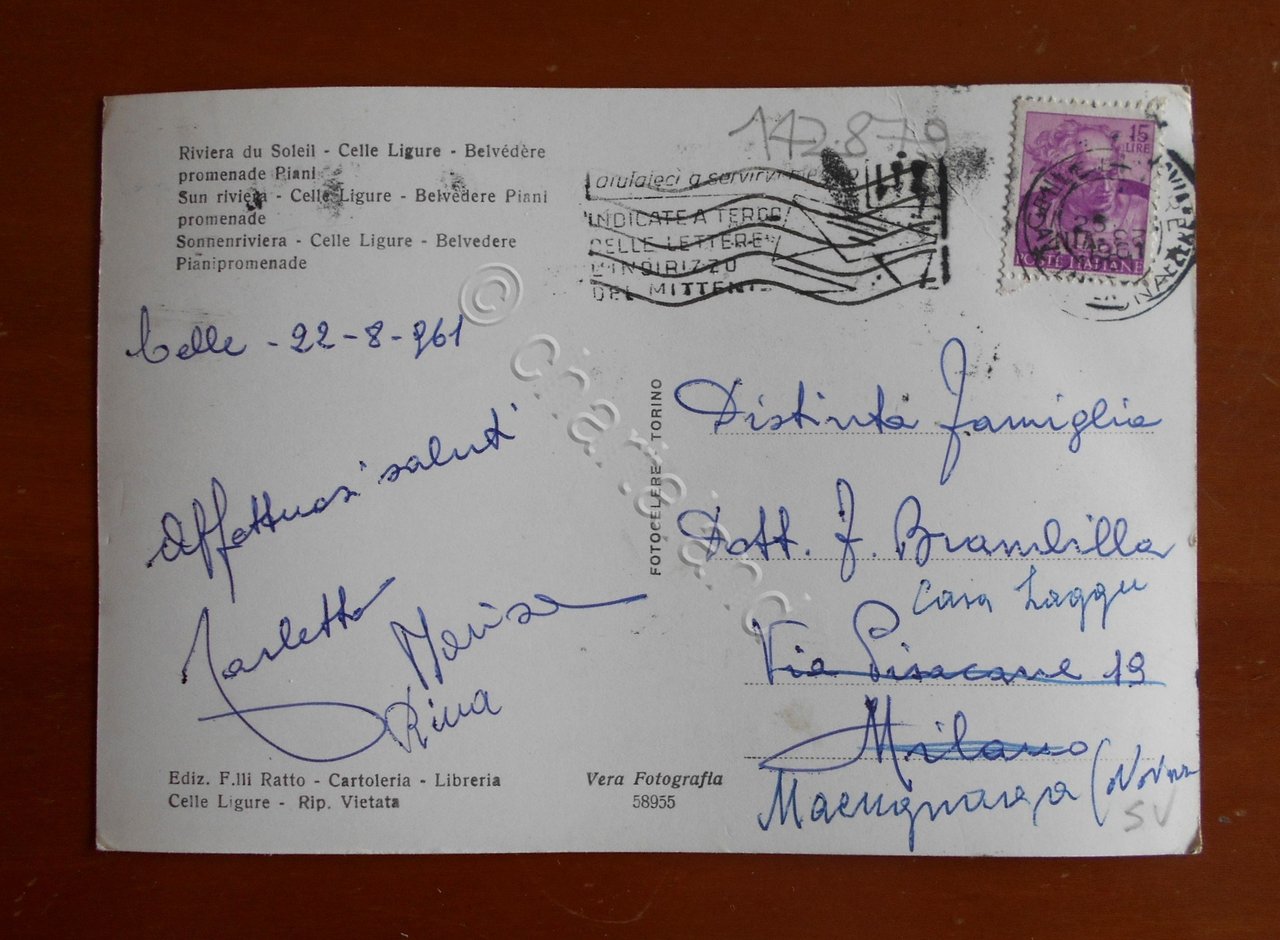 Cartolina Riviera del Sole - Celle Ligure - Belvedere passeggiata Piani - 1961