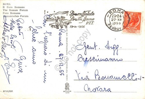 Cartolina Roma Foro Romano timbro a targhetta PT Buon Natale Buon Anno 1955