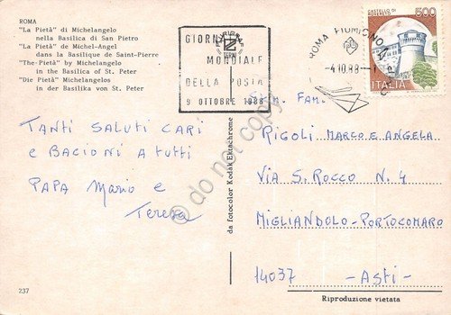 Cartolina Roma La Pietà Michelangelo Timbro quadrato Giornata della Posta 1988