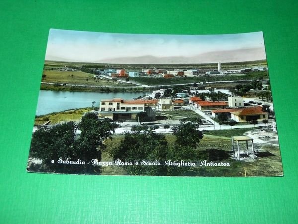 " *** Cartolina Sabaudia - Piazza Roma e Scuola Artiglieria Antiaerea. La cartolina è viaggiata. Datata 1953. Formato grande. Per appassionati studiosi e collezionisti