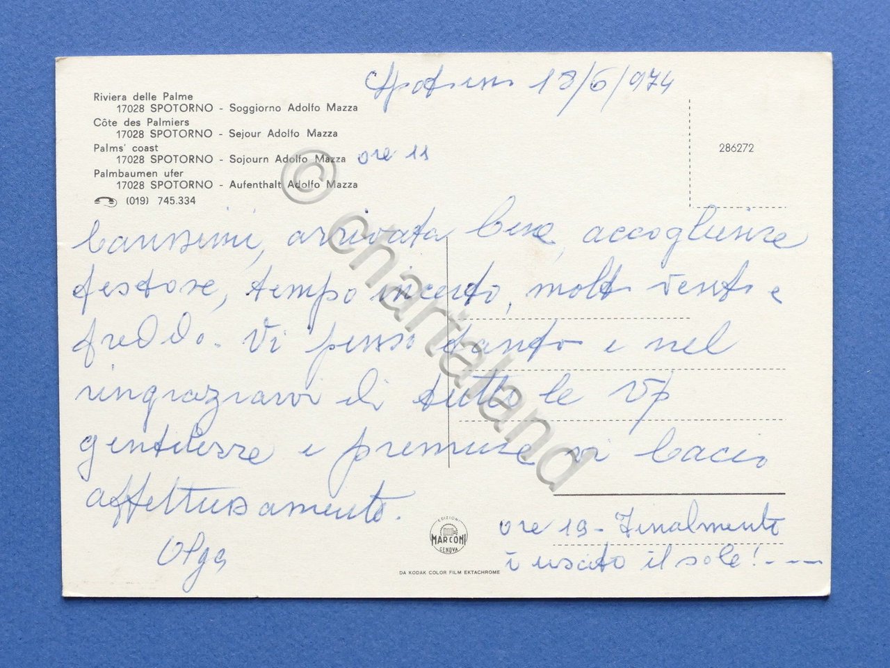 Cartolina Spotorno - Soggiorno Adolfo Mazza - 1974 1974 Cartolina formato grande - non viaggiata Condizioni buone, come da foto Scritta sul retro Per appassionati, studiosi e collezionisti
