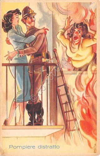 Cartolina Umoristica Militare Pompiere distratto