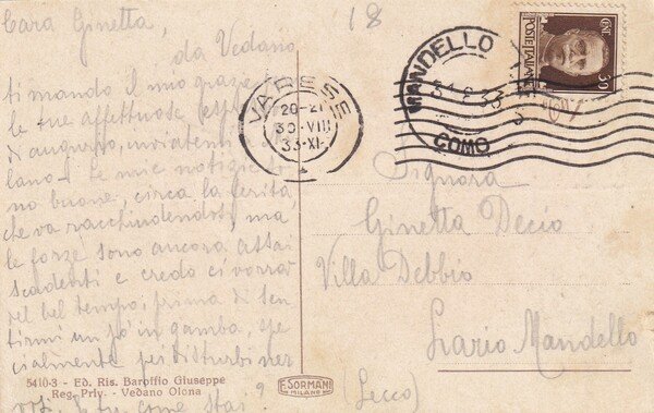 Cartolina Vedano Olona (Varese) - Dintorni della Stazione. 1933