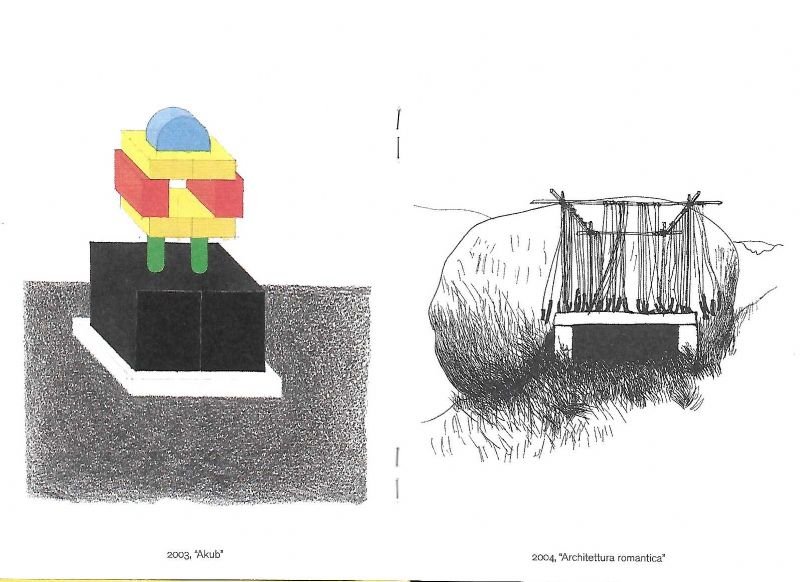 Cartellina in cartoncino giallo a tre pieghe di cm. 15x10,5, all'interno un opuscolo fermato a spilla di pp. 40, contenete riproduzioni di progetti , istallazioni e altri soggetti in nero e a colori, tutti sottotitolati. Tiratura in 1000 copie in occasione della mostra , '10 anni con Ettore' Milano, Aprile 2009.