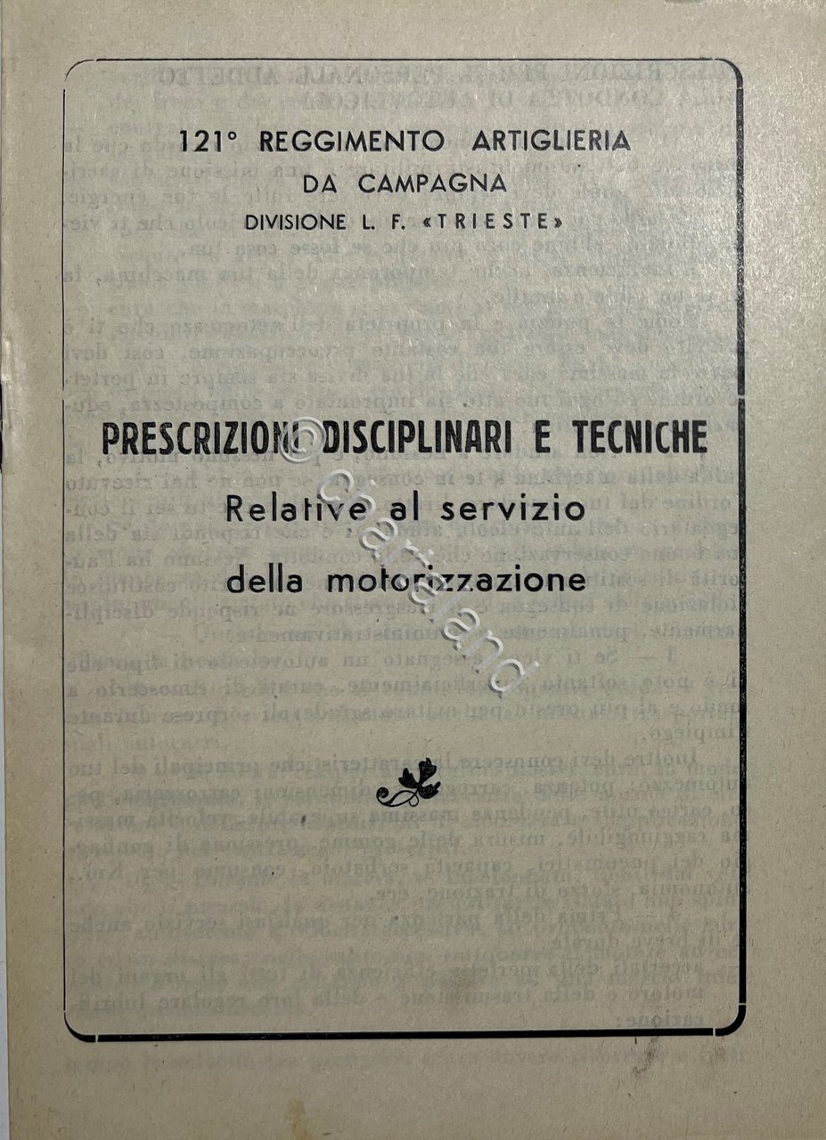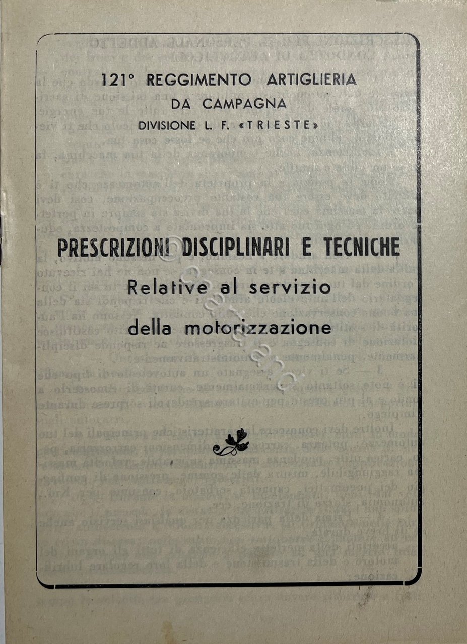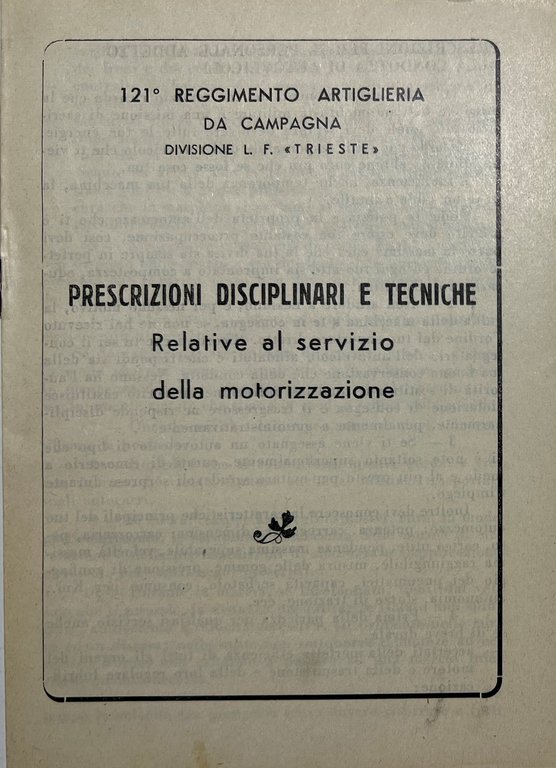121^ Reggimento Artiglieria da Campagna: Divisione L. F. Trieste - Prescrizioni Disciplinari e Tecnici: Relative al Servizio della Motorizzazione - Anni '40 Testo in lingua italiana. Pagine 6 Copertina morbida. Condizioni molto buone.
