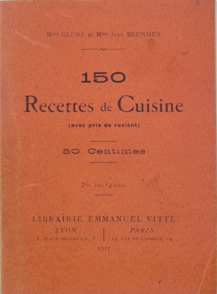 Librairie Emmanuel Vitte, Lyon, 1917. In/12 broché couverture orange imprimée, 92 p. Petite tache sur la couverture. Edité en 1917, ce petit livret donne aux mères de familles des recettes de cuisine élémentaires et “reconstituantes” : bouillie pour les enfants, pot au feu, soupe au choux et lard, manière d’accommoder les restes de viandes, riz au gras, pain perdu, purée de pois. et même des recettes d’oeufs sur le plat !