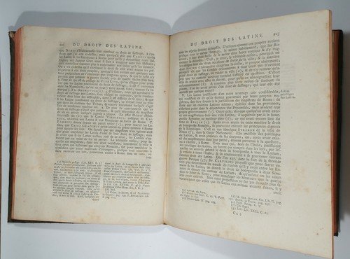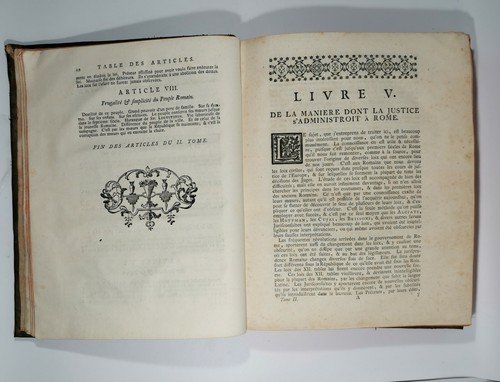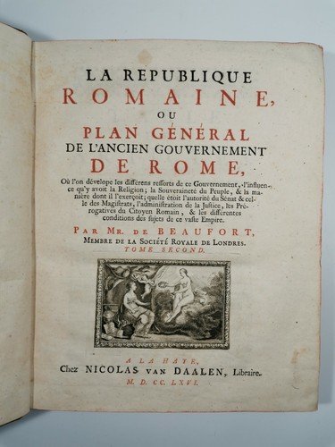 SOLO IL TOMO II. La Republique Romaine Ou Plan General De L'ancien Gouvernement De Rome di Louis De Beaufort. ou l'on develope les differens refforts de ce gouvernement, l'influence qu'y avoit la religion; la souverainete du peuple, & la maniere dont il l'exercoit; quelle etoit l'autorite du Senat & celle des magistrats, l'administration de la justice, les prerogatives du citoyen romain, & les differentes conditions des sujets de ce vaste empire. Par mr. de Beaufort, membre de la Societe royale de LondresA La Haye, chez Nicolas Van Daalen Libraire, 1766. 12, 434, (6) pagine, bella vignetta al frontespizio, testatine, finalini e capilettera istoriati. Copertina in tutta pelle di vitello maculata con titoli e fregi dorati al dorso, tagli colorati al dorso.