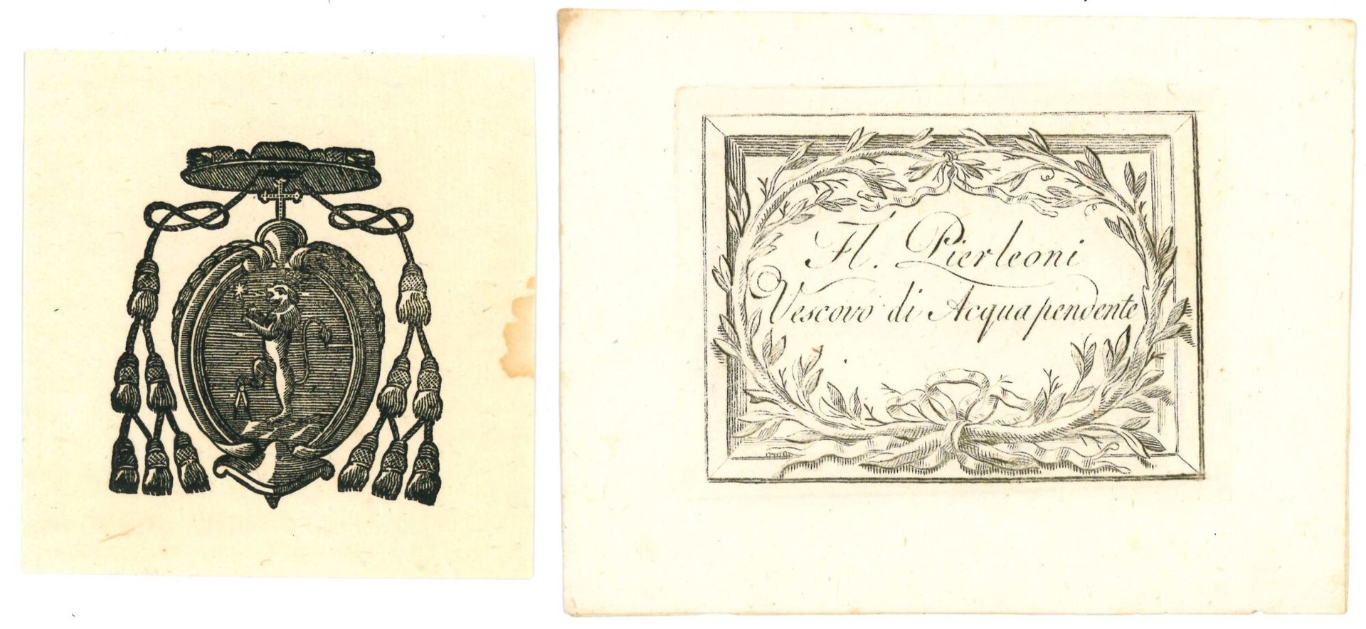 I. Mm. 141x107. Numero 18 biglietti da visita calcografici del vescovo Florido Pierleoni, con aggiunta di un ex-libris recante le sue armi in xilografia. Florido Pierleoni (1742-1829), del ramo umbro dell'omonima famiglia (Città di Castello), probabile propaggine del medesimo antichissimo casato romano, venne nominato vescovo di Acquapendente da Pio VII nel 1802.