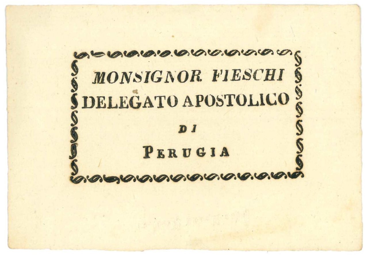II. Mm. 109x76. Biglietto da visita di Monsignor Fieschi. Adriano Fieschi (Genova, 1788-1858) è stato un cardinale italiano (dal 1834), e in precedenza fu delegato apostolico a Spoleto (novembre 1818-1823), a Perugia (marzo 1823), Macerata e Camerino (marzo 1826).
