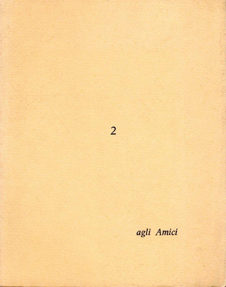 2 agli Amici, prima edizione dicembre 1985, formato 12 x 15.<BR>Copertina morbida color crema con alette e titoli in nero al piatto anteriore.All'interno una poesia di Dino Carlesi e una litografia di Maria Stuarda Varetti.<BR>Ottime condizioni.