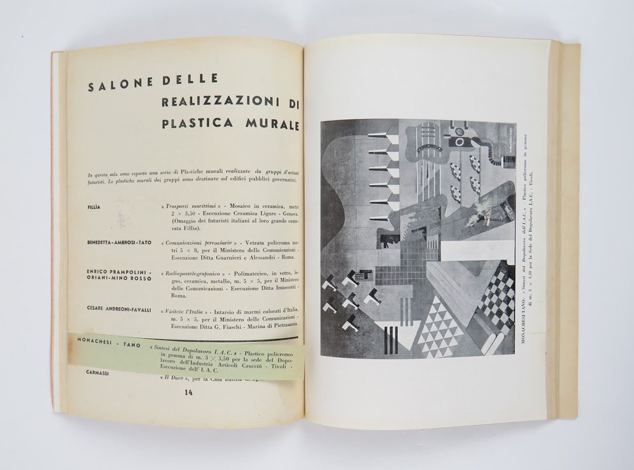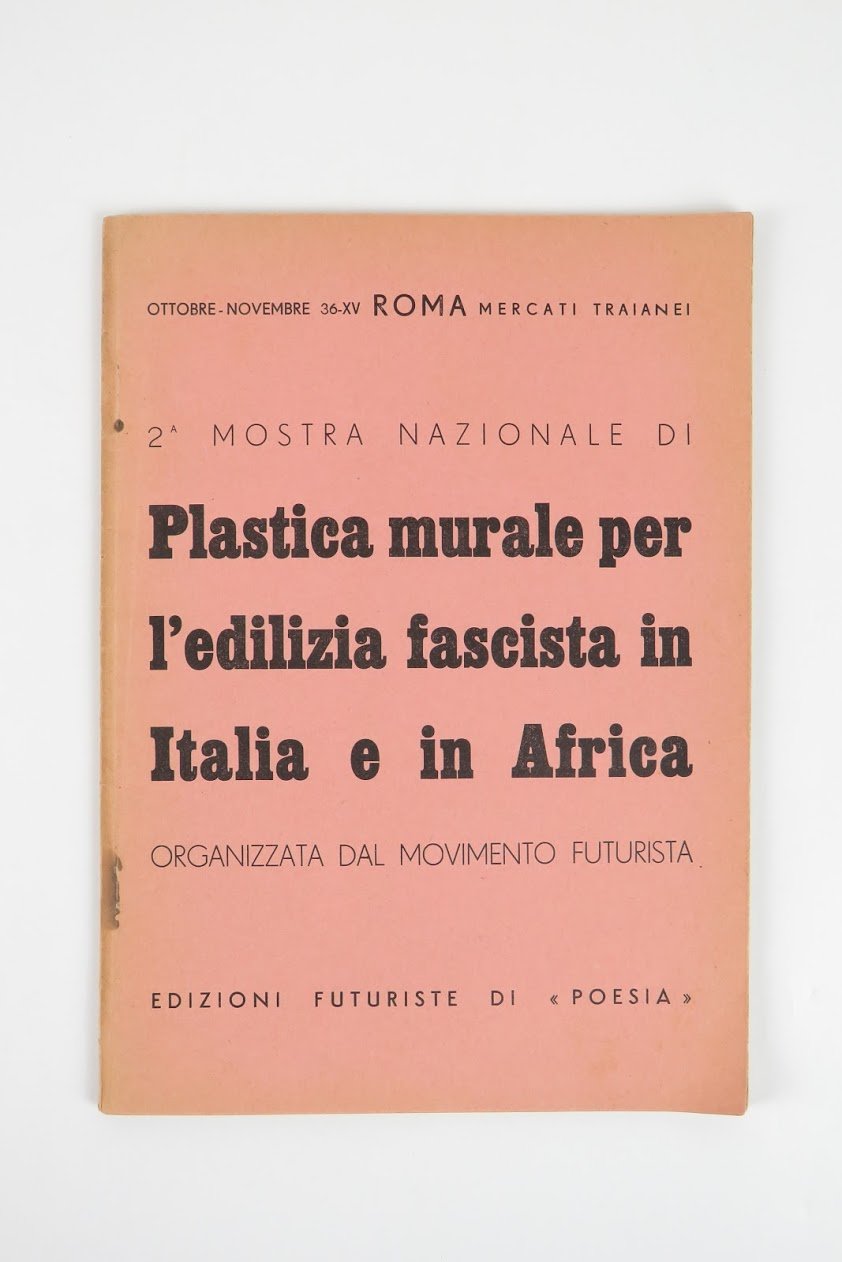LIBROEdizione originale.Esemplare dalla biblioteca di Luce Marinetti, come da timbro ex libris «LM»; in più che buone condizioni (dorso scolorito e parzialmente danneggiato, tracce di ruggine alla pinzatura), completo della striscia integrativa applicata a p. 14 che registra l’opera «Sintesi del dopolavoro» di Monachesi-Tano (peraltro riprodotta).Catalogo dell’esposizione che si tenne nei mesi di ottobre-novembre 1936 ai Mercati Traianei di Roma. Molto raro, con solo due esemplari attestati in ICCU (entrambi a Roma: Archivio Crispolti e Biblioteca CRDAV). «Diretta da Marinetti, Prampolini e Defilippis si svolge, a differenza della prima, su temi e ambienti prefissati. Un concorso viene bandito tra i trentotto partecipanti sui temi “La guerra italiana in Africa Orientale”, “L’Assedio economico”, “L’Aviazione dell’Italia fascista” e “Traffici marittimi”, mentre nel salone centrale sono presentate opere destinate a edifici pubblici di governo. Il tono delle opere esposte è generalmente meno sperimentale, più illustrativo e didascalico, come la critica contemporanea non manca di rilevare» (Diz. Fut.). L’idea di replicare un evento dedicato alla «Plastica murale», sulla scia del successo della mostra genovese del 1934, era in cantiere già alla fine del 1935, come sappiamo da una lettera di Fillia inviata a Marinetti nel dicembre 1935 e conservata nei Libroni di Yale [7982-1 e 7983-1]: «sembra che i permessi per la seconda mostra di plastica murale siano ben avviati ma temo per la sua organizzazione, date le mie gravi condizioni. Defilippis da solo non è in grado di provvedere». Il catalogo — sobrio e gradevole, ma nulla che vedere con quello di Genova edito sotto l’egida di «Stile futurista» — si apre con il manifesto «La plastica murale futurista», sottoscritto da Marinetti e da 45 futuristi di seconda e terza generazione (dove spicca l’assenza di Depero, pure coinvolto nel precedente genovese). Si tratta del medesimo testo già comparso su «Stile futurista» (n. 5, dic. 1934) con minime varianti. Segue un inedito di Prampolini («Funzionalità architettonica del polimaterico»), che teorizza la netta superiorità delle composizioni polimateriche sulla pittura murale tradizionale. Segue infine il regolamento dei due concorsi indetti dalla presidenza della mostra. Il catalogo è suddiviso in tre differenti sezioni: (i) le plastiche effettivamente realizzate per edifici governativi; (ii) i bozzetti ricevuti dai partecipanti al concorso; e infine (iii) in ossequio alla retorica della guerra coloniale, le opere degli artisti combattenti in Africa (con grande spazio dato a Domenico Belli). Seguono diverse pagine di pubblicità editoriale, perlopiù inerenti al settore delle costruzioni. Nelle [8] tavole fuori testo, oltre alla facciata esterna della mostra, progettata da Prampolini, sono illustrate le seguenti opere: trasporti marittimi di Fillia (“omaggio dei futuristi italiani al loro grande camerata”); radiotelegrafonico di Prampolini-Oriani-Rosso; comunicazioni ferroviarie di Benedetta-Ambrosi-Tato; sintesi dell’Africa di Prampolini; visitate l’Italia dell’inedita coppia Andreoni-Favalli; sintesi del dopolavoro dell’Industria Arredi Caucciù di Tivoli a firma del duo Monachesi-Tano (che in fase esecutiva vide la partecipazione anche di Peschi e Ketoff) e, infine, lo ieratico duce di Carmassi. Nuovi archivi del futurismo, I, 1936/19 (esemplare mancante della striscia integrativa); Cammarota, Marinetti, n. IX.65.