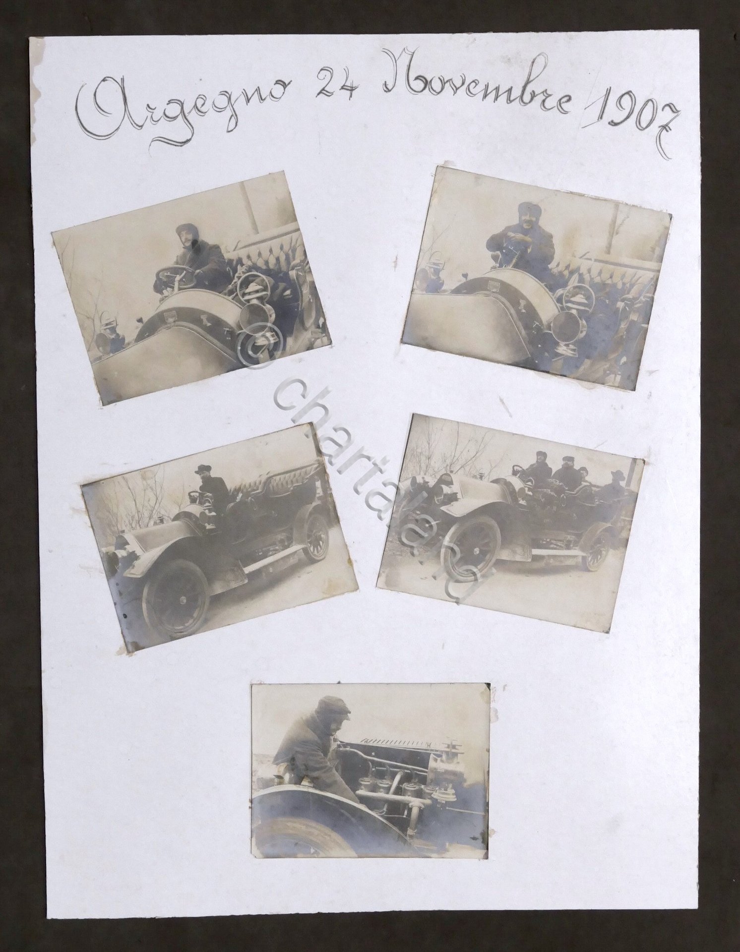 5 Fotografie oroginali Automobile d'epoca Humber Beeston four-cylinder Le fotografie sono applicate ad un cartoncino rigido (31, 5 x 42 cm) con intestazione Manoscritta: "Argegno 24 Novembre 1907" Dimensioni fotografie: 8 x 11 cm ca. cad. Buone condizioni generali.