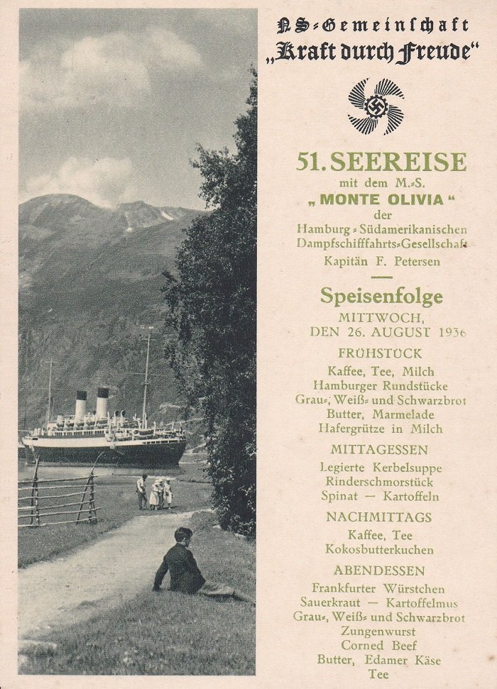 Die "Kraft durch Freude"-Reise im Jahr 1936 ging nach Norwegen, rückseitig ist die Beschriftung "Eidfjord" zu lesen. Der Deckel zeigt eine fotografische Abbildung (schwarz/weiss), den KdF-Aufdruck NS-Gemeinschaft "Kraft durch Freude" samt Symbol und darunter die Speisenfolge für das genannte Datum im August 1936.