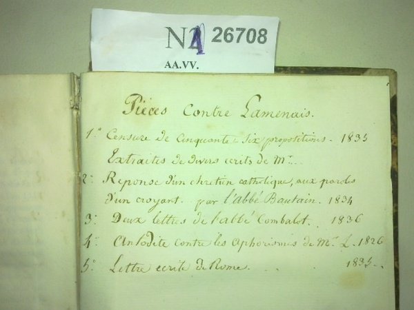 AA.VV. 6 PIECES DIVERSES CONTRE LES DOCTRINES DE LAMENNAIS. Douladoure. Toulouse / Fevrier. Strasbourg/ Gaume. Paris/ Id./ Le Clere. Paris/ Kersten. Liege. 1835 XXXIX+ 215 p./ 96p./ 99p./ 189 p./ VIII+ 110 p./ 29 eur. (21 cm) Enc. holandesa muy fatigada. AÑOS: 1835/ 1834/ 1836/ 1837/ 1826/ 1835. 1. CENSURE DE CINQUANTE-SIX PROPOSITIONS EXTRAITES DE DIVERS ECRITS DE M. DE LA MENNAIS, PAR PLUSIEURS EVEQUES DE FRANCE, ET LETTRE DES MEMES EVEQUES AU SOUVERAIN PONTIFE GRAGOIRE XVI; LE TOUT PRECEDE D’UNE PREFACE OU L’ON DONNE UNE NOTICE HISTORIQUE DE CETTE CENSURE, ET SUIVI DES PIECES JUSTIFICATIVES. / 2. REPONSE D’UN CHRETIEN AUX PAROLES D’UN CROYANT, PAR L’ABBE BAUTAIN. / 3. PREMIERE LETTRE DE M. L’ ABBE COMBALOT A M.F. DE LA MENNAIS EN REPONSE A SON LIVRE CONTRE ROME INTITULE AFFAIRES DE ROME. / 4. DEUXIEME LETTRE DE M. L’ABBE COMBALOT A M. F. DE LA MENNAIS, EN REPONSE A SON LIVRE CONTRE ROME, INTITULE AFFAIRES DE ROME. /( 5. ANTIDOTE CONTRE LES APHORISMES DE M. F. D. L. M. PAR UN PROFESSEUR DE THEOLOGIE DIRECTEUR DE SEMINAIRE. / y 6. LETTRE ECRITE DE ROME A UN PROFESSEUR DE PHILOSOPHIE, SUIVIE DE LA DECLARATION DE SOUMISSION AUX DEUX ENCYCLIQUES QU’ON EXIGE, A ROMA, DE CEUX QUI DESIRENT REDEVOIR LES SAINTS ORDRES. --- [RECOMENDADO] N1 (Ref.26708) frances teologia controversia lammenais liberalismo ortodoxia
