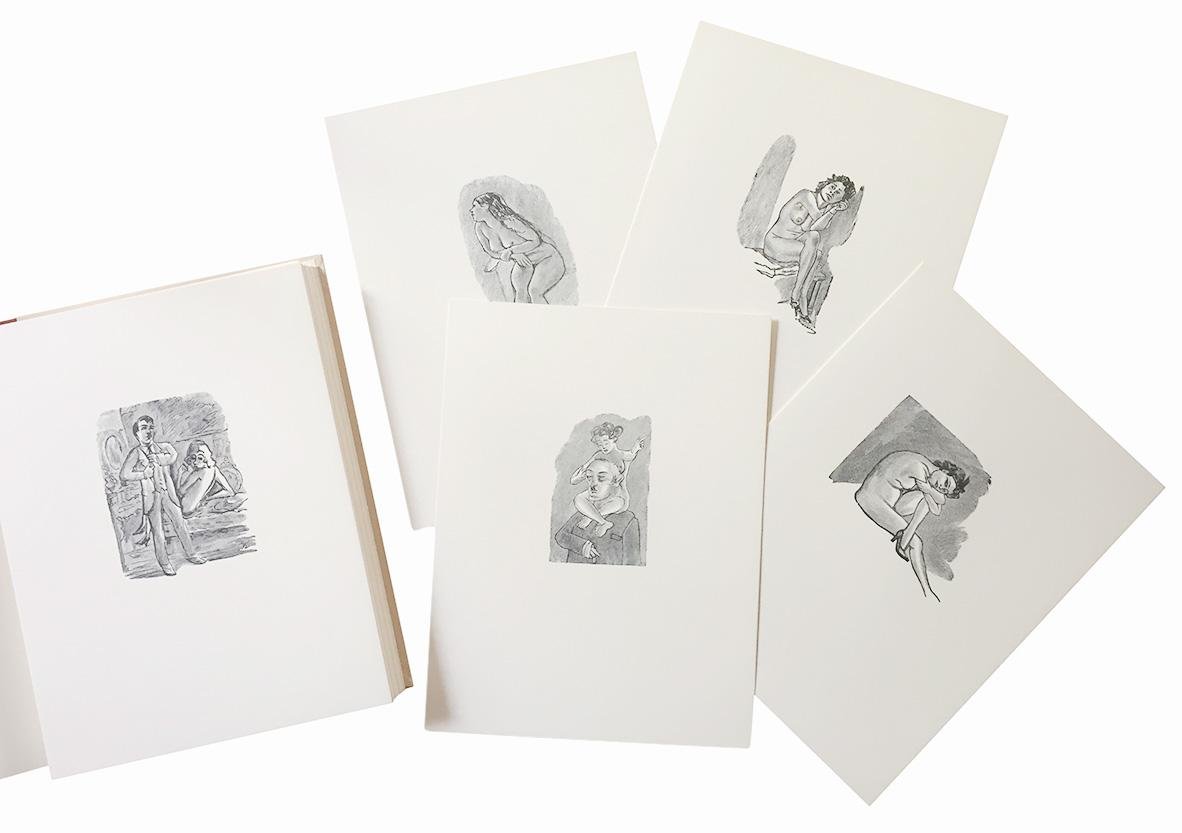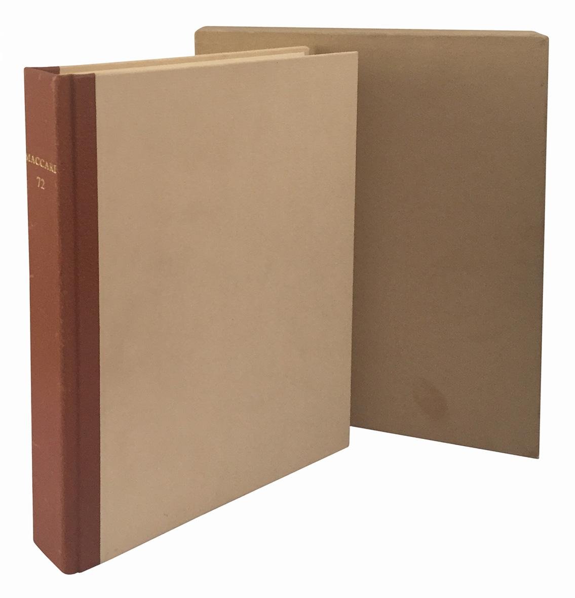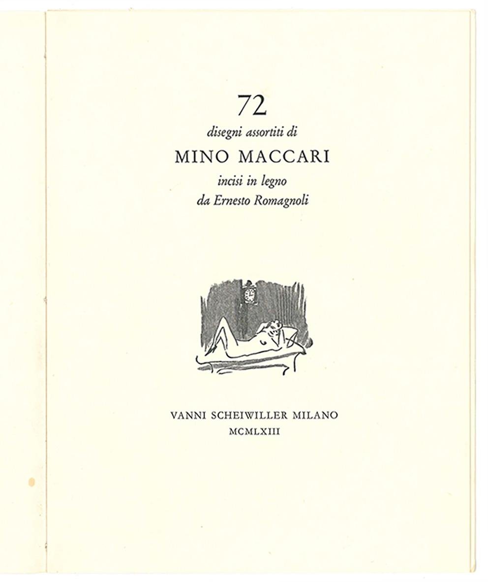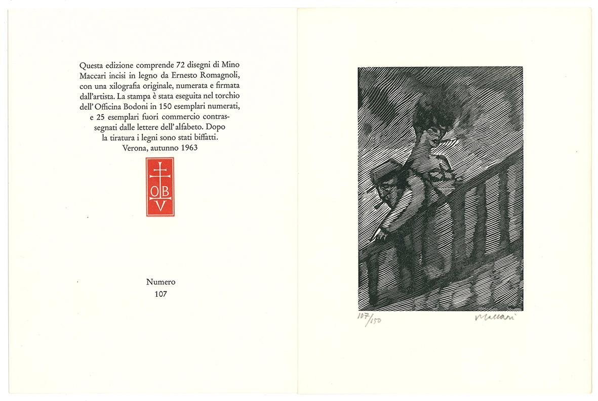 In 8vo (mm. 237x179). Pp. [2], 6, [4], 1 tavola xilografica e 72 tavole litografiche. Le carte di testo, contenenti alcune lettere scambiate tra l'artista e l'editore, sono raccolte in un opuscolo cucito a mano. Il volume include anche una xilografia originale di Mino Maccari, sciolta, numerata e firmata dall'autore (107/150), e 72 litografie sciolte, numerate al verso, incise da Ernesto Romagnoli su disegni dell'artista. Mezza pelle coeva con titolo in oro al dorso entro cofanetto editoriale in cartone.